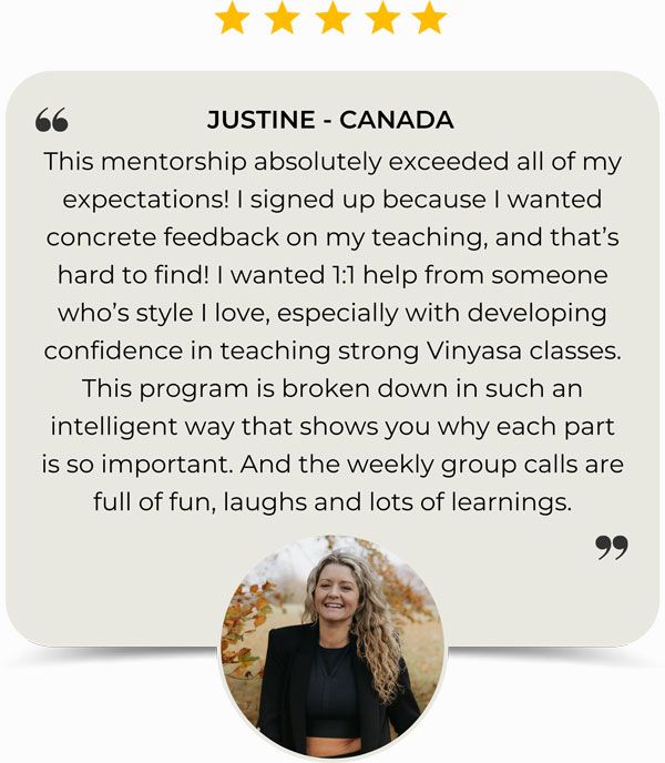 RISE is your 6-week online 1:1 yoga teacher mentoring program with Christine — built around your teaching, your yoga business, and what you're ready to build next. No fixed curriculum. Just six weeks of focused, personal work with me.